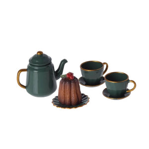 Decora una acogedora mesa de té navideña con este encantador juego. Tiene el tamaño perfecto para la familia de ratones. En su preciosa caja de regalo encontrarás una tetera de metal, dos tazas, un plato y un pastel de poliresina deliciosamente decorado.